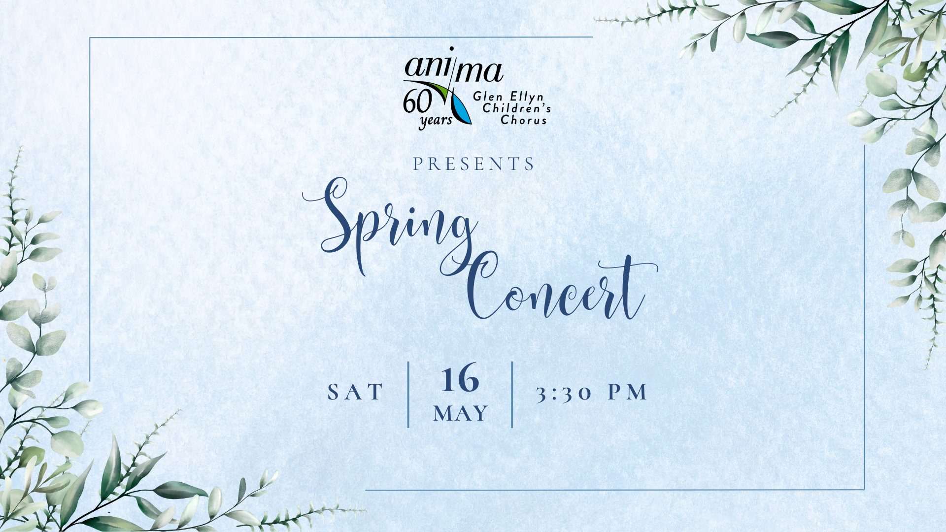 Back to All Events Anima Singers 61st Season Spring Concert Saturday, May 16, 2026 3:30 PM 5:30 PM TBD (map) Google Calendar ICS Please join us for the culminating event of our 2025/2026 season with our Anima Spring Concert! We look forward to sharing more details with you as the concert nears!